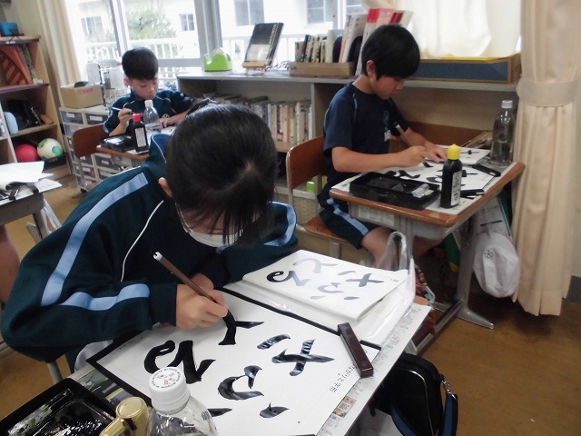 2025年11月6日 13時47分4年生の書写の学習では、漢字どうしの大きさに気をつけながら「白馬」を書きました。大きさだけでなく字形のポイントにも気を付けながら一画一画ていねいに書いていました。