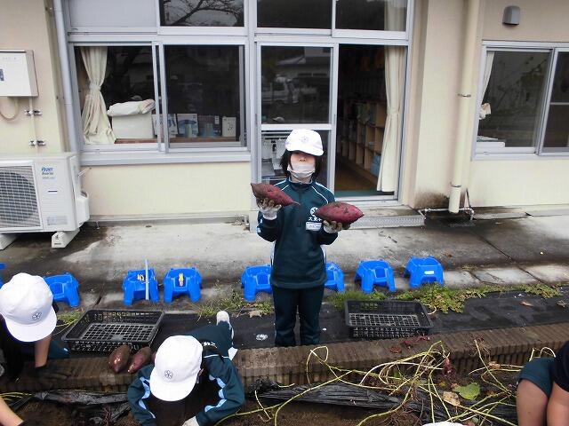 2024年11月15日 12時08分2年生が栽培してきた「さつまいも」を今日収穫しました。長いつるを取り払い、掘り進めると次々にサツマイモが出てきました。中には子どもの顔以上のさつまいもも出てきました。子どもたちは歓声をあげながら掘っていました。大収穫に子どもたちは大満足でした。