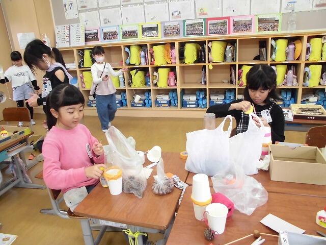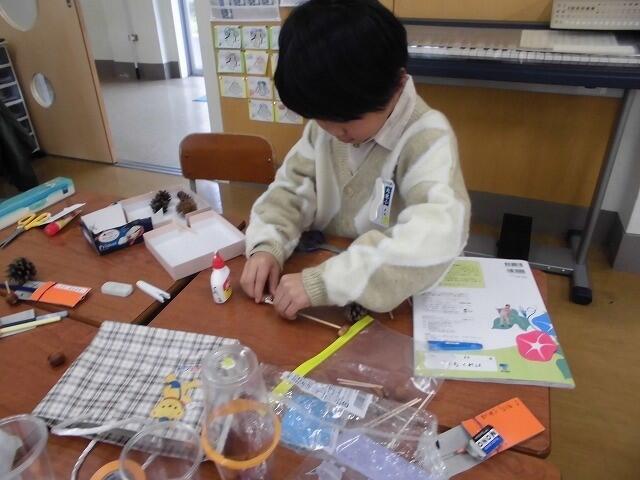 2024年11月15日 12時16分1年生は生活科の学習で見つけてきた木の実などを使っておもちゃ作りをしました。どんぐりゴマや木の枝を使った迷路、松ぼっくりを使ったけん玉など思い思いにおもちゃを作りました。作りながら深まる秋を感じた1年生でした。