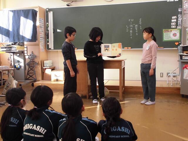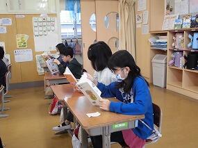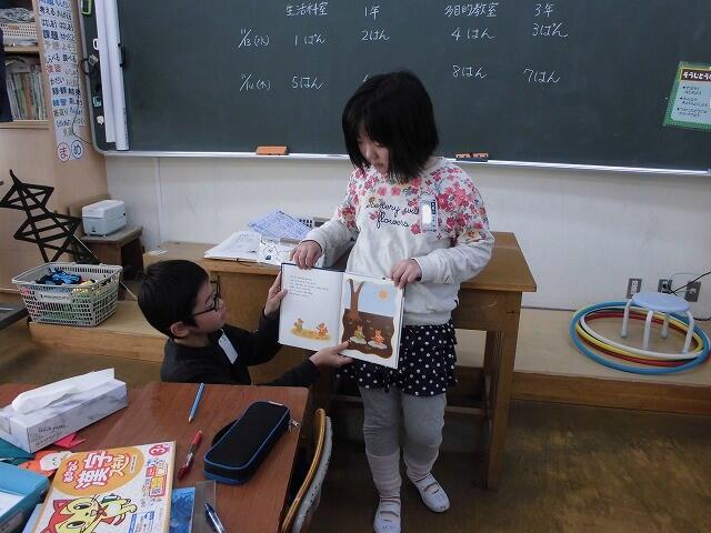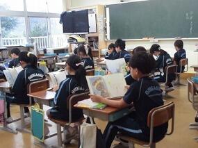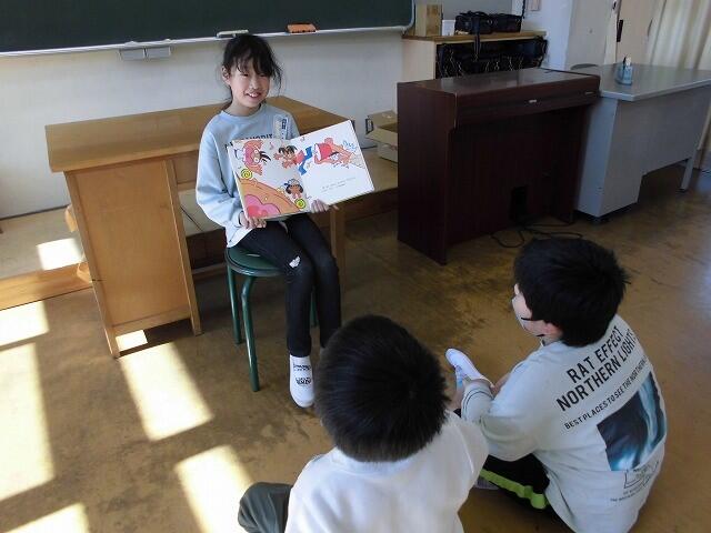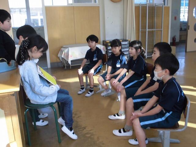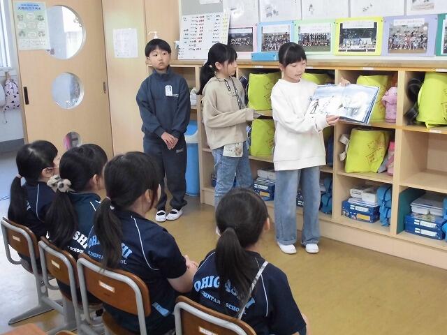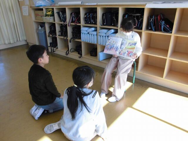 2024年11月13日 08時38分3年生が国語の学習で進めてきた「1年生に本の読み聞かせをしよう」を今朝実施しました。各班ごとに1年生に読み聞かせをしました。1年生が楽しめるよう、本の見せ方や読み方など班で相談して練習してきました。1年生は熱心に読み聞かせに聞き入っていました。