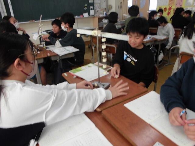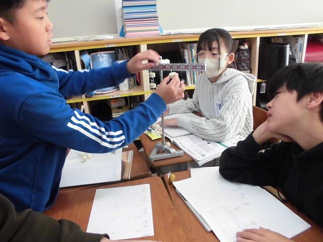2024年11月13日 09時46分6年生の理科では、てこのはたらきについて学んでいます。今日は、実験用てこを使ってどういう場合に左右のてこがつり合うか実験を通して確かめました。いくつかの組み合わせを試すうちに、左右のてこを下げる力を表した数値が同じであればつり合う事に気づき、いろいろな組み合わせをして確かめていました。