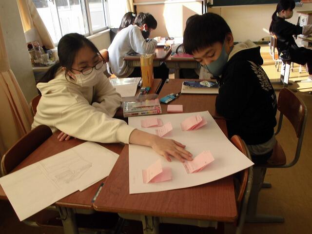 2024年11月14日 10時08分5年生の国語では、「話し合い」について学習しました。よりよい学校生活を目指して「5分前行動を守るためには」を議題として班ごとに話し合いました。自分が守ること、みんなが守ることに分けて考えを整理したり、付せんを使って同じ考えをまとめたりして話し合いました。