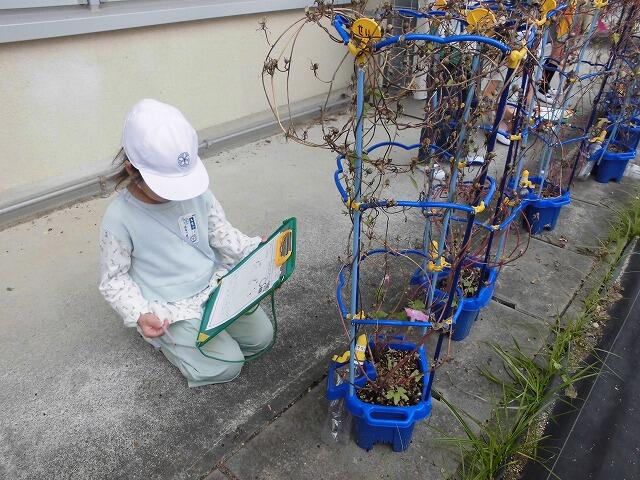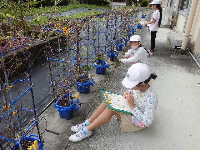 随分涼しくなり、1年生が育てているアサガオも秋の装いになりました。今日の生活科では、秋のアサガオの観察をしました。まだ花をつけている鉢もありましたが、ほとんどは葉が枯れ、たくさんの実をつけていました。中には、こぼれた種から芽が出ているのを見つけた子もいました。1年生は、身の回りの自然と関わり合いながら成長しています。