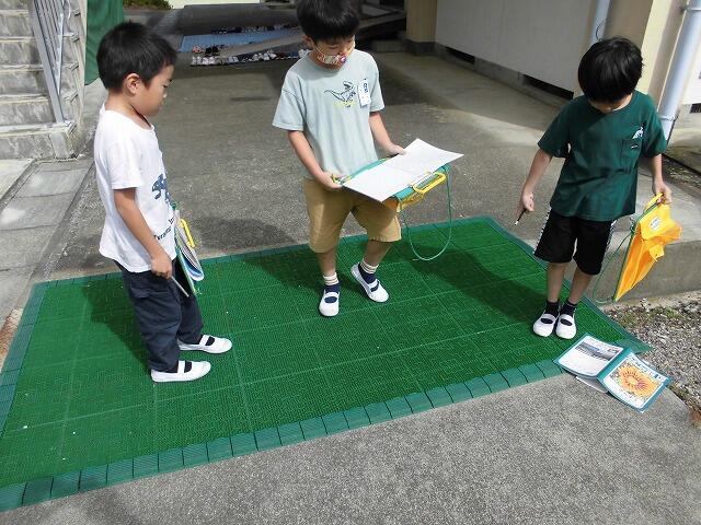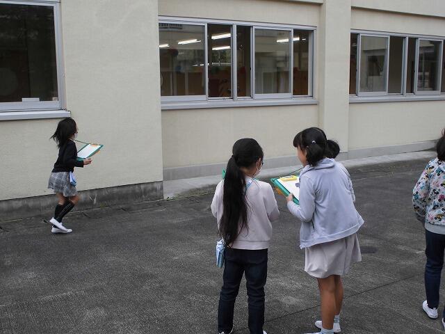 2年生が算数で学習している「四角形」が身の回りにあるかどうか校舎内を探し回りました。教室の窓やマット、配電盤などさまざまな「四角」を見つけていました。学習したことと自分の身近なものをつなげることで、学習をさらに深めています。