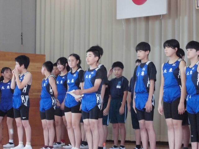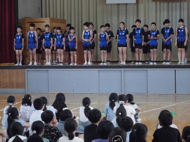 来週行われる岩瀬地区陸上交流大会に参加する6年生へ、壮行会を行い全校生からエールを贈りました。選手の自己紹介の後、代表児童から自己記録に向けて全力を出し切ってきますと力強い言葉が話されました。その後、5年生がリーターとなって全校生で応援の気持ちをエールにして伝えました。