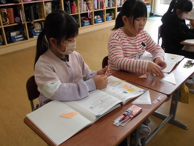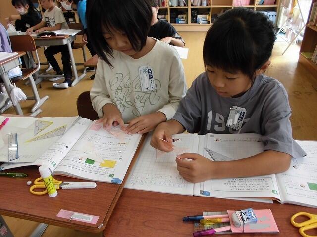 今日の2年生の算数では、「直角」の学習をしました。正方形の向かえ合う頂点で4つに切った三角形に「直角」があるか、2つ組み合わせたら直角でできたのはなぜか。実際に切って確かめたり、友達と考えを交流したりしながら学習を進めました。