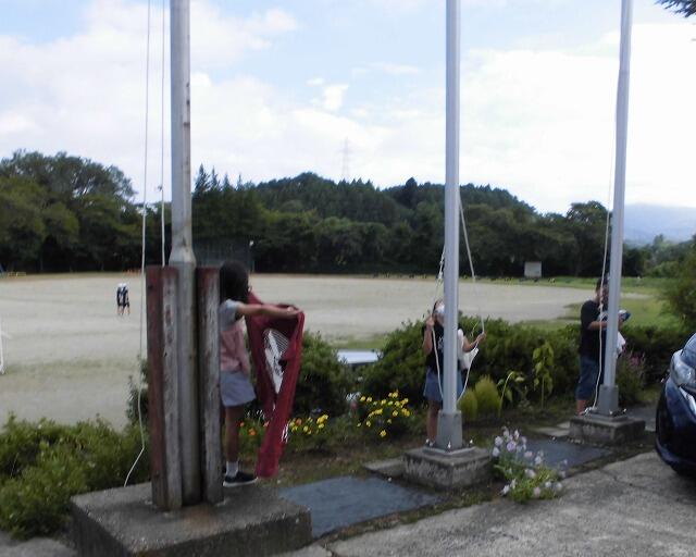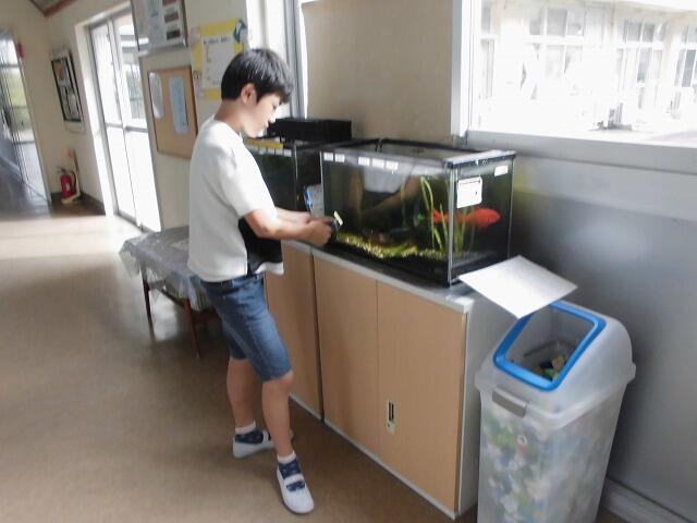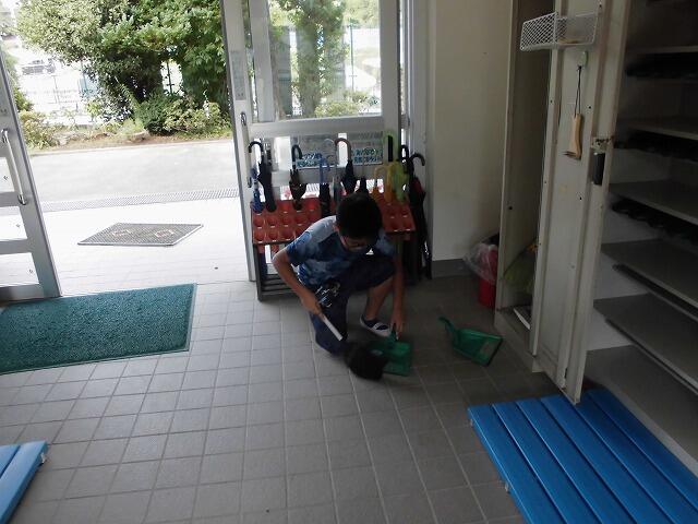 2024年9月18日 08時25分大東小では、4年生以上の子どもたちが毎朝「ボランティア」に取り組んでいます。昇降口の掃き掃除や校旗揚げ、水槽清掃などを分担して行っています。今日も時間になると自主的にボランティアにとりくんでいました。