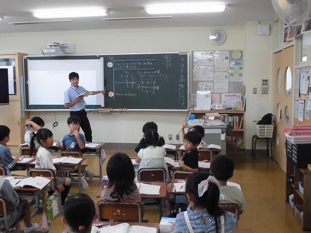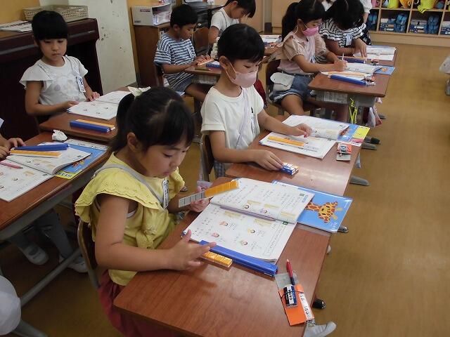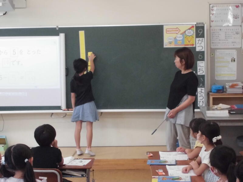 1年生の算数では2桁の計算の仕方を考える際、算数ブロックを使いました。10のまとまりとバラをブロックでつくり、そこから加えたり、引いたりして確かめました。まだまだ頭の中で考えることは難しい子どもたちも、ブロックを使うことで具体的に数を捉えることができていました。