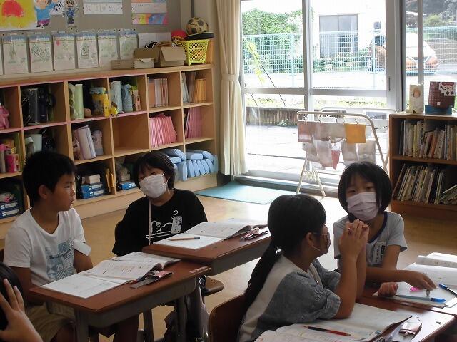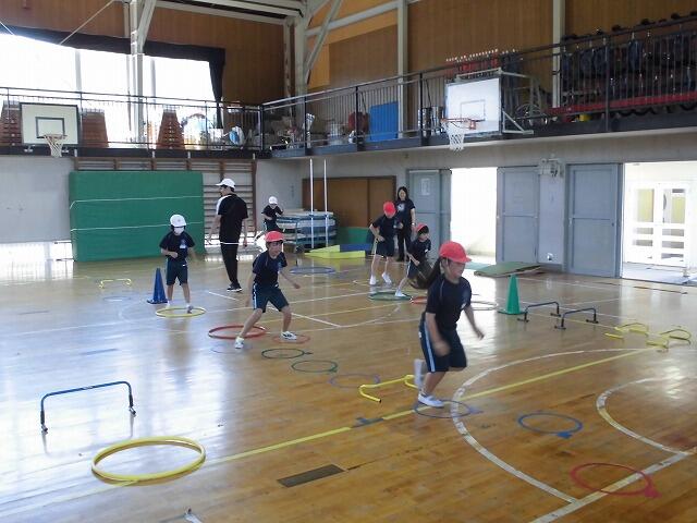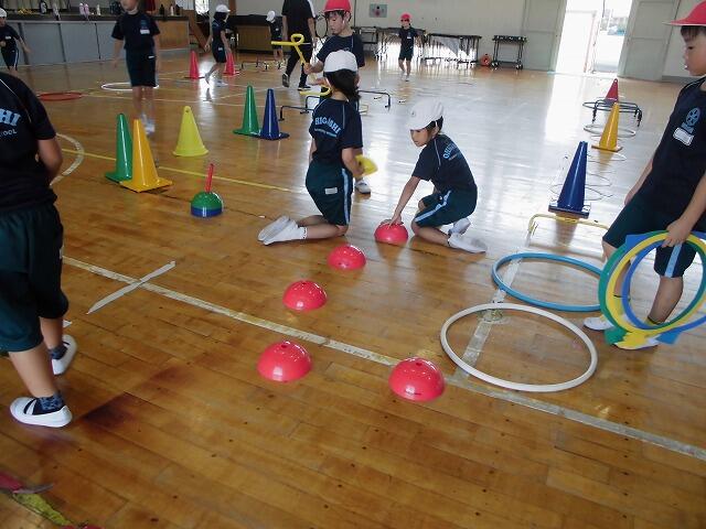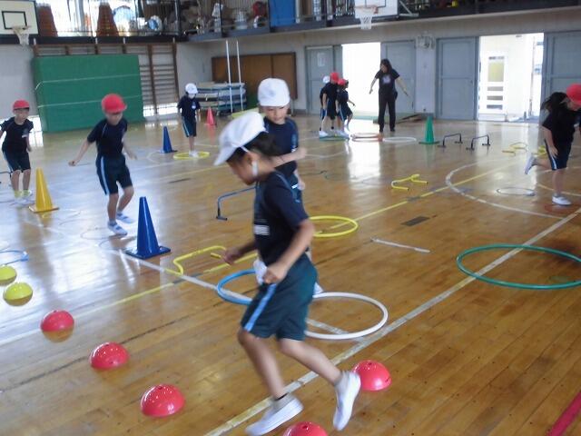 2年生の体育では、用具を使って「とぶ、はねる」運動の場を班ごとに作って運動していました。子どもたちには「忍者の修行の場をつくろう」と呼び掛けて自主的に考えさせていました。子どもたちは、こうするとリズムよく跳べるね、忍者なら何回もとばなくちゃね、と工夫しながら場づくりに取り組んでいました。交互に違う班の場でもチャレンジし、意欲的に運動に取り組みました。