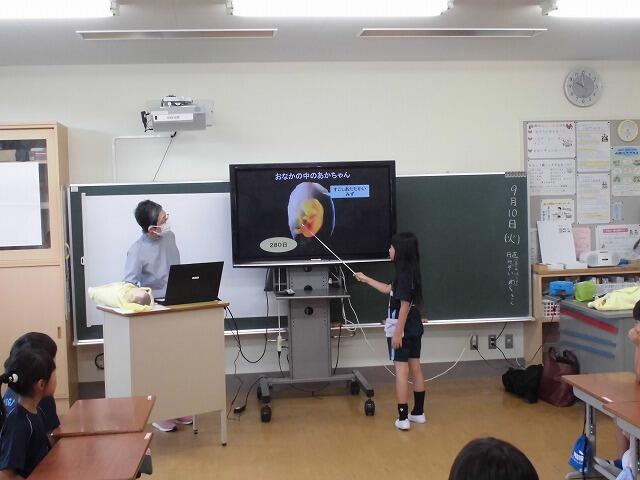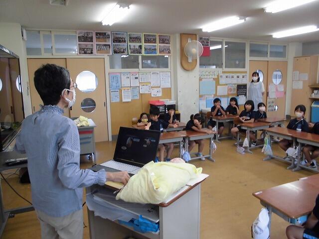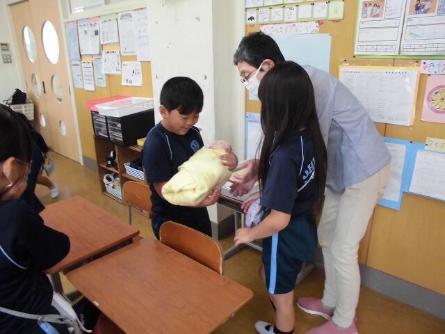 2年生で「思春期講座」を行いました。助産師の先生においでいただき、赤ちゃんがどのように母親の体の中で成長していくか教えていただきました。実際の赤ちゃんの体重と同じくらいの人形を抱っこした子どもたちは、その重さにびっくりしていました。また、母親のお腹の中では、「へその緒」を通じて栄養と酸素をもらっていることを知って、「命」のすばらしさを感じていました。