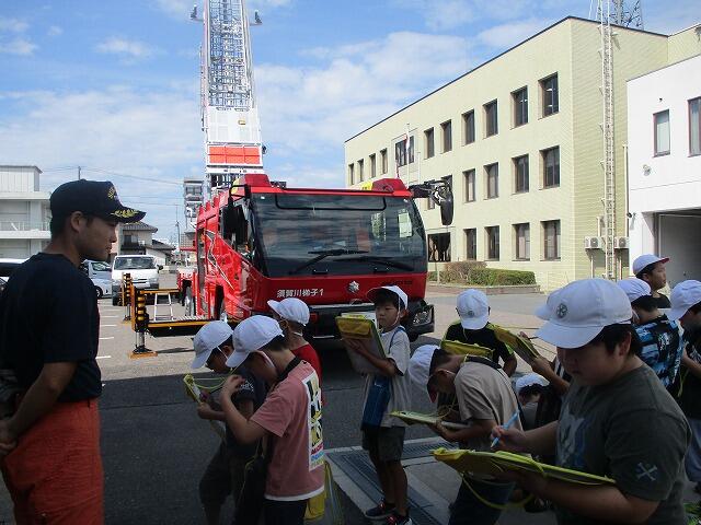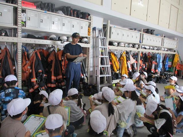 私たちのくらしを守っていただいている「消防署」を3年生が見学しました。消火の際に力を発揮するポンプ車などの車両を見せていただいたり、消火服を実際に着させていただいたりしました。子どもたちは、消防署のはたらきやそこで働いている人たちのねがいや苦労を知り、自分たちは多くの人たちから守られていることに気づくことができました。