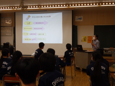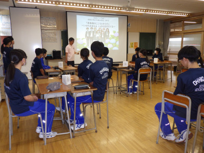 講師として本校の卒業生でミュージシャン・ラジオプロデューサー・ディレクターとして活躍している佐藤正彦様とラジオパーソナリティー・ボーカリストとして活躍するモミ様をお迎えし、「ラジオから学んだこと~その可能性と未来~」という題で講演いただきました。また、講演会後はお二人の演奏をお聞きでき、校歌を全員で歌うこともできました。