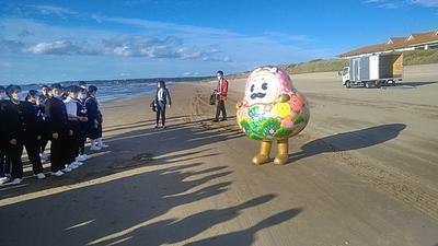 石川県の観光PRマスコットキャラクターの「ひゃくまんさん」が生徒たちを出迎えてくれ、記念写真を撮ってくれました。ちょっとした石川県からのサービスでした。ありがとうございました。