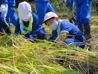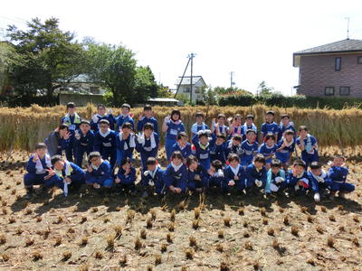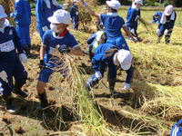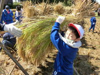 地域のお年寄りの方や中学生に鎌の使い方や稲架掛けのしかたを教えていただきました。作業は大変でしたが、子どもたちは稲刈りを楽しむことができたようです。