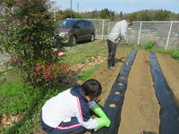 2023年3月27日 11時09分お昼前、校長先生が整備してくださった畑でじゃがいもの植え付けと白菜の茎立ちをしました。