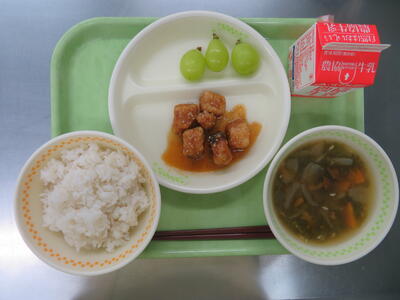 健康委員会の児童が、相馬産のあおさや郡山産のなめこについて紹介してくれました。デザートには、須賀川産のシャインマスカットも登場し、子どもたちは大喜びでした。