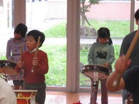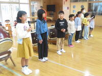 はじめに、5・6年生が曲紹介のお手本を披露してくれました。多目的ホールに響き渡る声に、下級生たちも感じるものがあったらしく、自分たちも気持ちを込めて練習に取り組もうという意識を持つことができたようです。