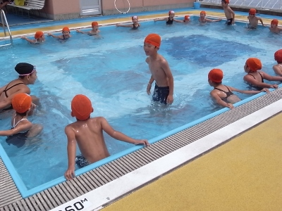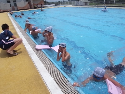 2015年7月9日 13時08分 7日、第2回の水泳教室がありました。特別講師の鳥居久美子先生に、今回は1年、2年、6年生が指導していただきました。1,2年生は小プールで、水慣れからいろいろな水遊びをしました。その中で、顔をなかなか水につけられない子がだんだんに水をこわがらないようになってきたようです。6年生は、今回は背泳ぎがテーマでした。ビート板を上手に使って、キックの練習をしていましたが、とにかくバンバン泳いでいて、ずいぶん上達しているなあという印象でした。夏休みに、お子さんとプールに出かけて実力をためしてください。楽しみですね。