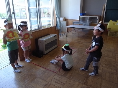 1年生、「大きなかぶ」の発表、グループ練習、気合いが入っていました。