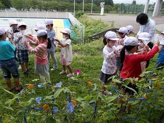 2020年7月17日 09時21分このところ、梅雨空が続き、今日も夏とは思えないほど肌寒い朝となりました。学校では、1年生が育てている朝顔が花を咲かせています。今日は、しぼんだ花びらをとって「いろみず」作りをしました。子どもたちがビニール袋に花びらと少しの水を入れて軽くもむと、きれいな色が出てきました。
