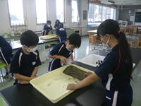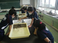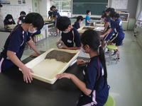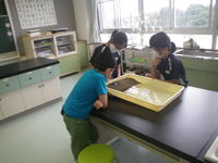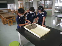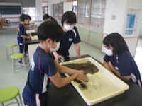 2020年7月27日 17時40分5校時目に5年生は、理科の学習で、流れる水にはどのような働きがあるのかを調べました。バットの中に、土を使って斜面をつくった後、バットの下に雑巾などを置いてかたむけて水を流し、土がけずられるところや土が積もるところについて調べました。5年生は、班の中で協力し合い、意欲的に実験に取り組みました。