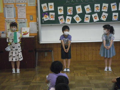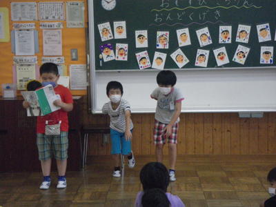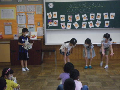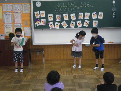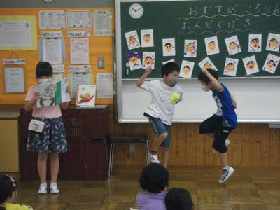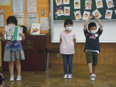 2020年7月28日 17時00分3校時目に1年生は、国語の学習で、「おむすびころりん」の朗読発表会を行いました。グループごとに朗読する場面のイメージを考えて、動きを工夫しながら朗読しました。どの子も、上手に発表することができました。