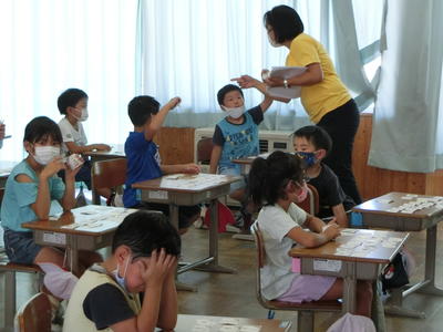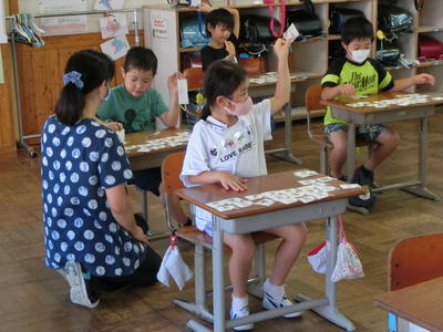 2020年8月27日 11時24分3校時目に2年生は、リア先生と一緒に英語を勉強しました。内容としては、絵カードを使って、アルファベットを覚えたり、そのアルファベットを使った動物や物の名前を英語でいう言い方を覚えたりする学習でした。2年生は、担任やリア先生の話をよく聞いて楽しく学習することができました。