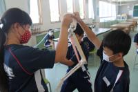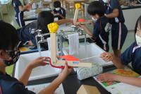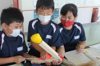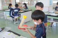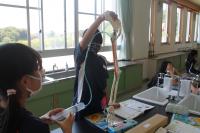 2021年6月10日 16時03分3校時は、4年生の理科を学習しました。授業の前半は「体が動くしくみ」について、より理解が深まるように実験を行いました。うでを曲げる時には、腕の内側の筋肉である上腕二頭筋(力こぶ)が縮み、腕の外側の筋肉である上腕三頭筋が緩みます。以前、自分の体で各自やってみたのですが、あまり実感がなかったようですが、この実験をしたところ、「あ~なるほどね。」と一目瞭然だったようです。逆に腕を伸ばす時には、腕の外側の筋肉である上腕三頭筋が縮み、腕の内側の筋肉である上腕二頭筋が緩みます。普段、自然に腕の曲げ伸ばしをしていますが、人間の体の仕組みの精密さには、驚かされますね。関節があるから、腕の曲げ伸ばしができることも確認しました。また、骨の人体模型だけでは分からなかった、骨に筋肉がついているということも、骨と筋肉の模型を使って、理解を深めることができました。授業の後半は、ヘチマの成長を観察に行ったり、「1日の気温と天気」の単元で、グループごとに気温を測ったりしました。子どもたちが測定した気温は29℃。百葉箱の気温は、25℃。気温を測る条件を考えて作られた「百葉箱」は、扉は北向き・風通しのよい場所・地面から1.2~1.5mの高さのため、子どもたちの測定記録とは誤差がでました。暑い1日でしたね。