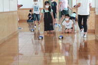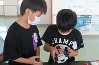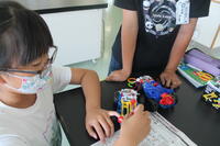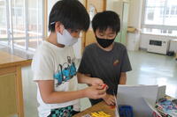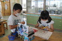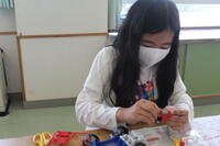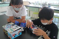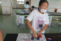 2021年6月28日 11時33分2校時は、4年生の理科を学習しました。今学習しているのは、「電流のはたらき」です。この単元では、まずはじめに、乾電池とモーター、プロペラを使って車を作り走らせてみて、気づいたことや疑問に思ったことを話し合い、電流の働きについて調べる学習をしています。まずは、車つくり。今日で3回目ですが、ほぼ全員作り上げることができました。ビニル導線の準備でもひと苦労。ビニル導線のビニルを爪でつまんで引っ張り取るのですが、導線までとれてしまうのではないかと不安になり、「先生~来てください。」と助けてコールが聞こえました。ビニル導線やモーターにプラグを付けるのですが、導線のビニルが出ないように巻き付けることが難しく、何度もやり直す様子が見られました。モーターにギアを取り付けるのも、きつくて大変。たくさんの困難な場面を乗り越え、車輪を付けて完成。完成した人から、自然と科学の部屋の中で自由に走らせていました。だいたいの人ができあがった頃、廊下に出て、「白江F1」を開催。F1と言えば、規定に沿った車を使い、これに反する車両は出走が認められないですね。この理科の車も一緒です。「あれ?後ろに走っちゃう。」「〇〇さんは、とっても速いな。」など、自分の車と友だちの車との違いを見つけると、車両を見比べる姿が見られました。ギヤが空回りしないように、タイやをしっかりと押し込むことが難しかったようです。次回は、少し時間をとって、「白江F1」の続きを行いたいと思います。