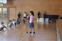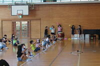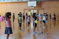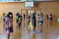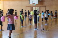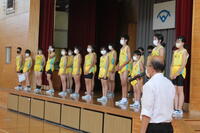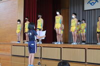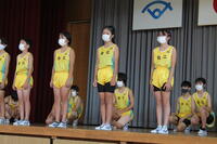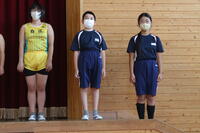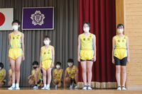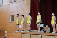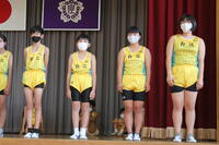 そして迎えた選手壮行会。進行は、5年本田くん。はじめの言葉は、4年阿保さん。選手入場の曲は、2020年に流行した「♪チョコレートディスコ」でした。白江小学校の選手が着るユニフォームは、鮮やかな黄色。ステージに立つ選手の皆さんとこの曲が調和して、気持ちが上がりました。選手紹介では、名前を呼ばれ返事をした後、自分の目標を発表した5・6年生。大会を翌日に控えた子どもたちの目は、自信に満ちあふれているように感じました。児童代表励ましの言葉では、5年森さんが力強く伝えてくれました。壮行会の終盤は、朝練習に励んだ『華の応援団』が登場しました。5年森さん・4年阿保さん・4年二瓶さんの3名による、手作りポンポンを使った応援。ここでは、和太鼓のリズムやポンポンの振り付けに合わせて、全校生が手拍子をしてパワーを送りました。その後、選手代表の6年小林くん・6年本多さんより、お礼の言葉がありました。そして最後は、全校生による「かけ声」。たった一言であること、マスクを着用していることを考慮して、英語でかけ声を行いました。応援団が「We can」と言った後、全校生が「do it!」。最後は応援団が「We can」と言った後、全校生が「win!!」と言い、エールを送りました。選手の退場曲は、2018年に流行した「♪さくらんぼ」でした。終わりの言葉は、4年二瓶さん。こちらも、力強い言葉で会をまとめてくれました。全校生の応援は、選手に届いたことと思います。