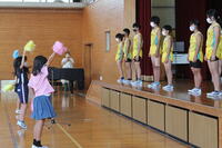 2021年10月6日 16時10分10月4日(月)の松なみタイムには、いわせ地区小学校陸上競技交流大会の出場する選手の皆さんにエールとパワーを送る、「選手壮行会」を行いました。コロナウイルス感染防止を第一に考え、松なみ委員会の4~5年生で考えたところ、「声は出せなくても、ハンカチを振って応援しよう!」ということになりました。また、選手入退場も、例年は和太鼓の「ドンドンドンドン~」のリズムでしたが、今年度は曲を流すことに決まりました。そして、曲を選んだのは、松なみ委員会の6年生3名です。運動会で毎年買っている流行曲のCDから、パワーが出そうな曲を選んでくれたため、ハンカチを振りやすくなりました。