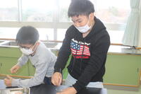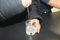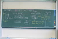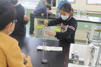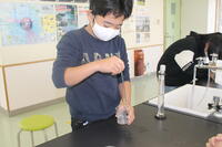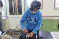 今日は、新しいことをもう1つ学習しました。それは、メスシリンダーを使って正しく50mLをはかりとる練習をしました。メスシリンダーを使うと、決まった体積の液体を正確にはかりとることができます。保護者の皆様にとっては、「メスシリンダー」という言葉が懐かしいのではないでしょうか。「50」の目盛りの少し下のところまで液を入れ、真横から液面を見ながらスポイトで液を少しずつ入れ、液面を「50」の目盛りを合わせました。1人ずつパフォーマンステストとして、やってみました。また50mLとは、液面のへこんだ部分が「50」の目盛りに合うようにすることが難しいようで、「うわ~50を過ぎちゃった。」「あ~50に合わすのが難しい。」と、つぶやきが聞こえてきました。