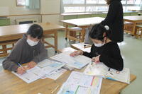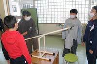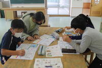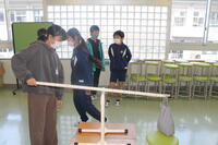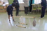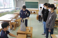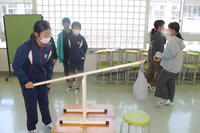 2021年11月26日 13時05分3校時は、6年生と理科を学習しました。「5kgの砂袋を1番小さい力で持ち上げるには、どうしたらいいかな?」という課題について考えた6年生。前時は、5kgや10kgの砂袋を提示し、まず両手で持ち上げて重さを体感しました。「うわ~重い!」「片手では10kgは持ち上がらない。」など、それぞれ感じたことを伝えあった子どもたち。次に棒1本を使い、同じ砂袋を持ち上げてみました。棒を使うと、使い方によって重く感じたり、軽く感じたりすることを体感し、「不思議だ。」「同じ5kgなのに。」と、首をかしげていた子どもたち。この続きから、学習を行いました。まず、前時に「不思議だ!」と話していた、同じ重さなのに重く感じたり軽く感じたりするのはなぜかを、実験をしながら考えていきました。前時に学習した、①棒を支える位置「支点」②力を加える位置「力点」③おもりの位置「作用点」について復習した後、本時の課題「5kgの砂袋を1番小さい力で持ち上げるには、どうしたらいいかな。」を実験。子どもたちは、変える条件と変えない条件をはっきりさせて、順序よく実験する姿が見られました。「作用点(おもりの位置)を変えてみよう。おもりを支点に近づけよう。」「力点(力を加える位置)を変えてみよう。支点の近くを持ってみよう。」など、グループで相談して手応えを話し合っていました。