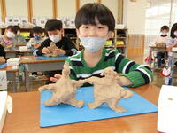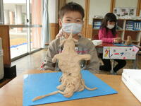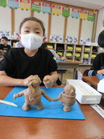 2021年12月22日 11時23分1年生の図工「いっしょにおさんぽ」では、一緒に散歩に行きたい仲間を思い浮かべて表したいことを見付け、いろいろな形などを捉えながら、形を選んだり考えたりして、表したいことを工夫して粘土で表すことを学習しました。粘土を使って「ひねりだし」という手法を学び、粘土の塊から、手や足の部分をひねり出して、自分と動物を作ることができました。頭の中でイメージした自分や動物を、粘土を使って表現することができました。