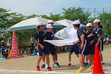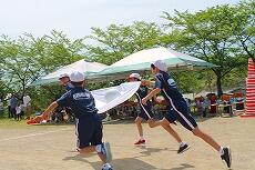 5・6年団体種目は、4人で布の端をもって、ボールを落とさずに走りました。