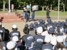白江小学校は、写真を見せながら自慢の校舎や縦割りの仲のよさをPRしました。