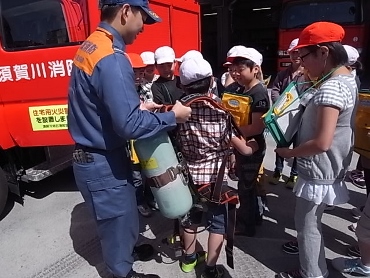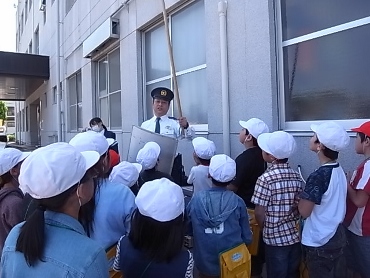 2015年5月12日 09時00分 11日、4年生20名が須賀川広域消防署と須賀川警察署を社会科の学習で見学させていただきました。消防署では、司令室を見学した後、救急車やポンプ車の中がどのようなものを備えているのかを実際に見せていただきました。特に、レスキュー隊の訓練の様子には、迫力と緊張感があって感動していたようです。須賀川警察署でも、パトカーや施設を見せていただきました。橋本署長さんが、出てきてくださり、子ども達に「おまわりさんになりたい人いる?」