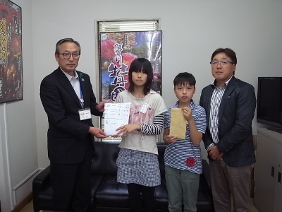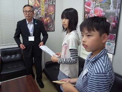 2015年5月25日 08時45分 児童会で取り組んだ「緑の募金」が全校で、6千円近くも集まり、このほど市の農政課へ届けてきました。児童会松なみ委員会の委員長古川さんと副委員長の佐藤さんが、農政部長さんに手渡しし、「須賀川市の緑を増やすためにつかってください。」とお話することができました。全校生のみなさん、保護者のみなさん、募金のご協力をありがとうございました。