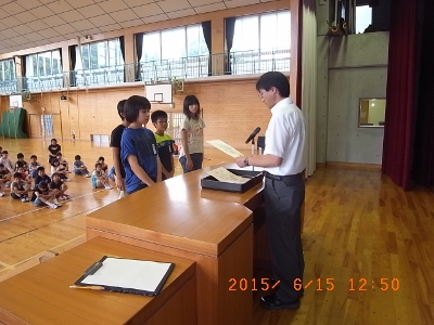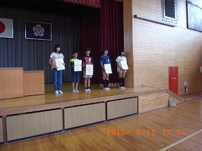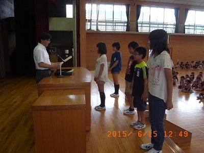 2015年6月17日 15時41分 15日、全校集会で第1回の全校表彰を行いました。今回は、歯のコンクールの標語で入賞者2名、6年生の歯の健康状態が良好な児童2名、それと先の全国陸上日清カップ県南大会の入賞者の5名の選手の表彰を行いました。受賞者の皆さん、おめでとうございます。