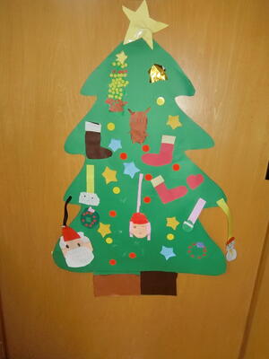 もうすぐやって来るクリスマスを楽しみに、折り紙や画用紙で、手作りのクリスマスツリーを作りました。