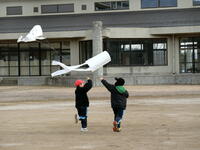凧に糸を結ぶ練習もしました。指先を上手に使うことが必要です。ようやく凧が完成。いざ校庭へ!