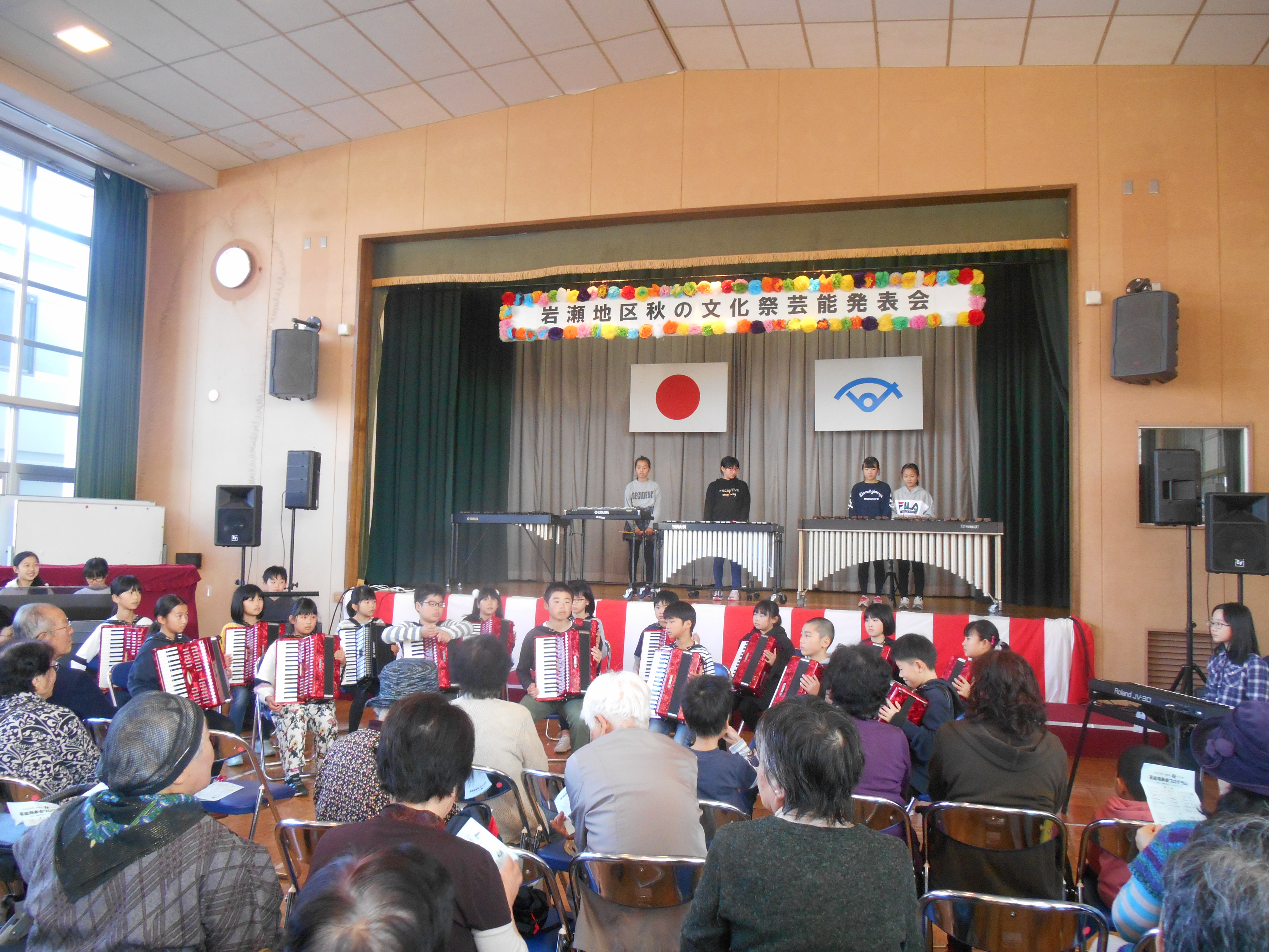 2018年11月4日 13時05分11月4日(日)、白方小特設合奏部が、岩瀬地区秋の文化祭「芸能発表会」で、たくさんの地域の皆様の前で、演奏を披露しました。曲目は『和声と創意の試み第1集「四季」より冬』(地区合奏祭「金賞」・県合奏祭「銅賞」受賞曲)です。特設合奏部の皆さんは、これまで培ってきた力を発揮し、堂々とした見事な演奏を行いました。